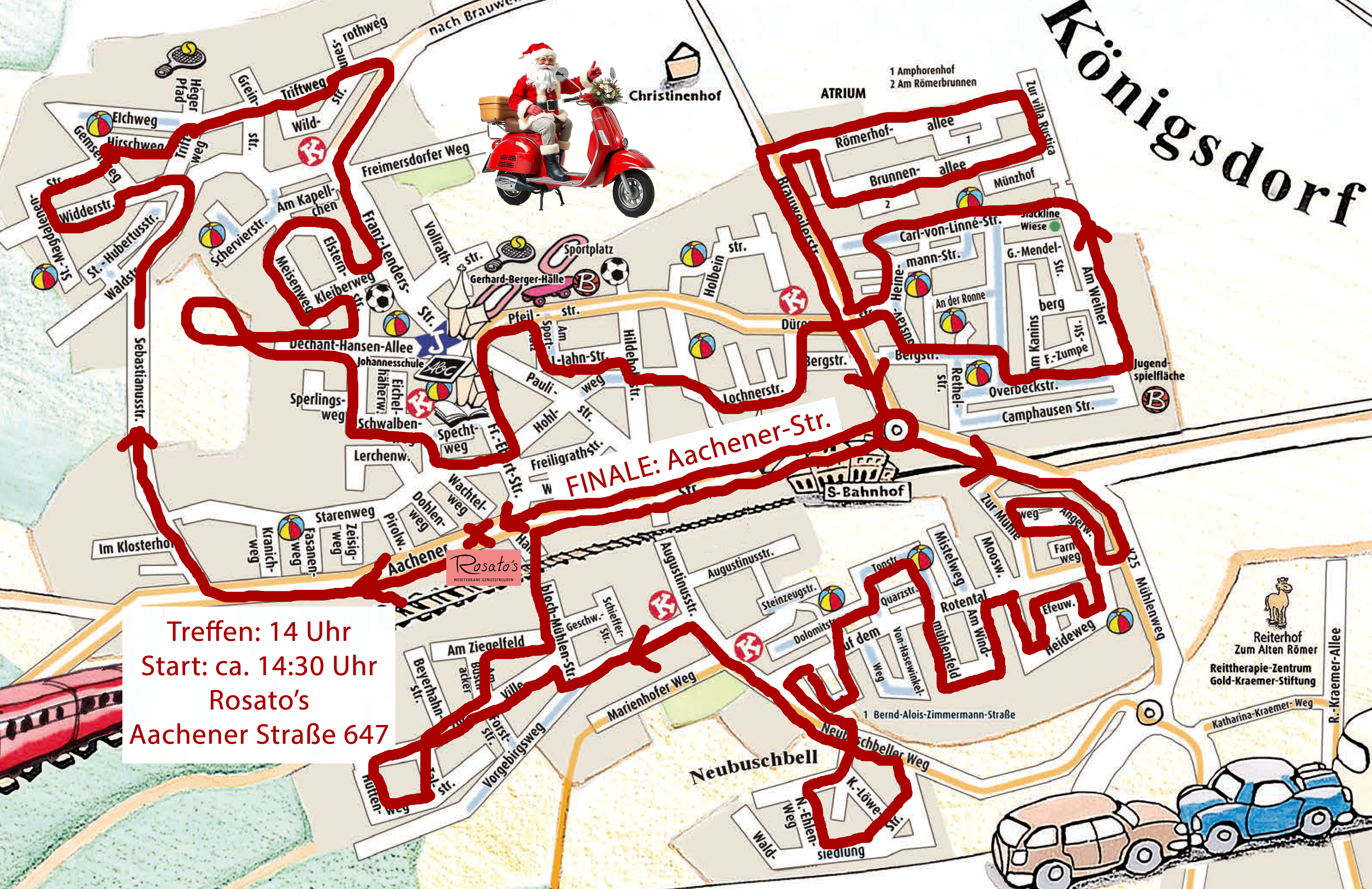 Zum ersten Mal findet in Frechen-Königsdorf eine Vespa Babbo Natale Fahrt statt! Dabei treffen sich Vespa-Freunde und andere Rollerfahrer in weihnachtlichem Outfit, um gemeinsam mit ihren festlich geschmückten Rollern durch die Straßen zu fahren und adventliche Stimmung zu verbreiten.