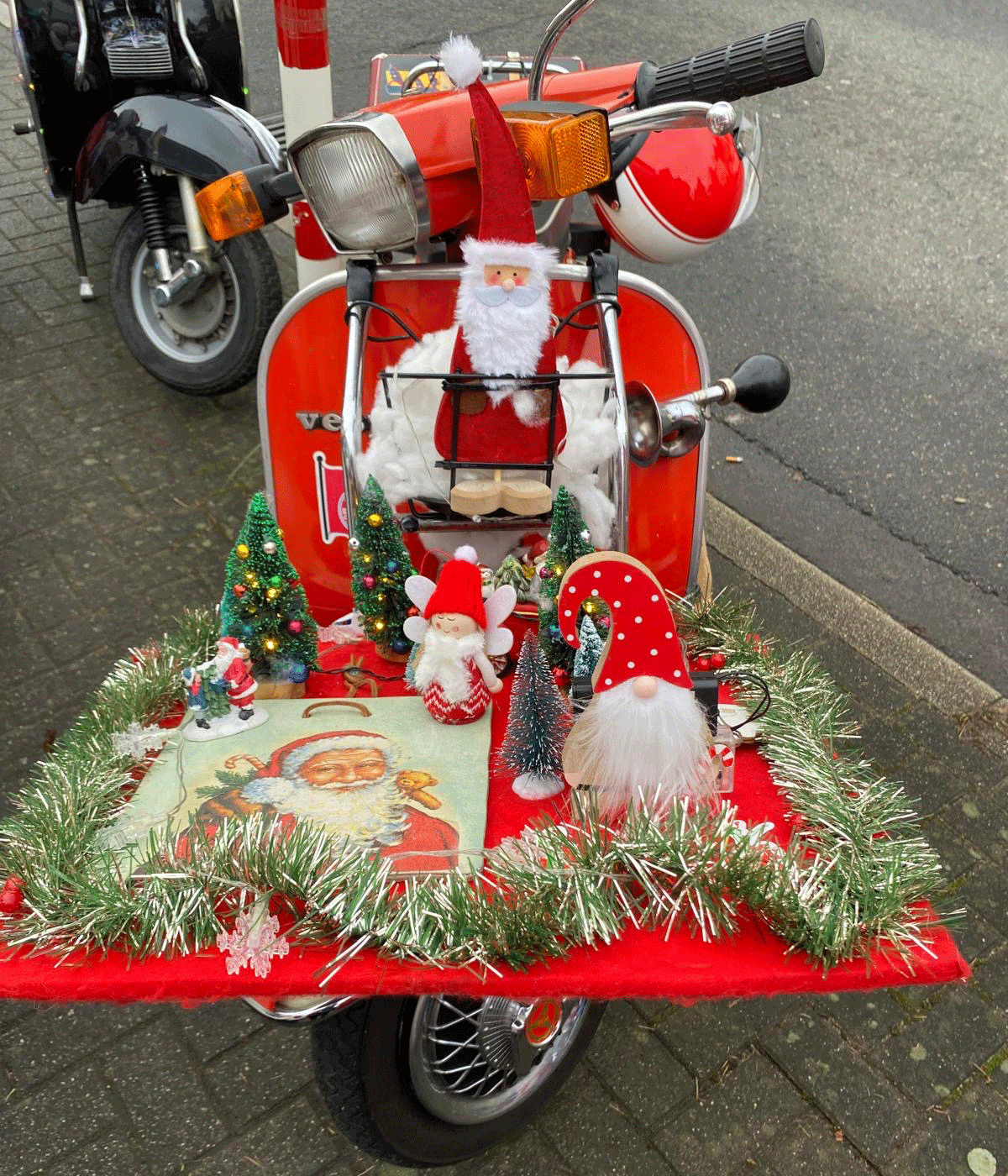 In Italien nennt man den Nikolaus „Babbo“. Schon seit vielen Jahren ist es dort Tradition, in der Vorweihnachtszeit verkleidet als Weihnachtsmann oder Nikolaus auf motorisierten Zweirädern durch die Straßen zu fahren. Dieses fröhliche Spektakel begeistert Jung und Alt – und natürlich macht es auf einer VESPA besonders viel Spaß.